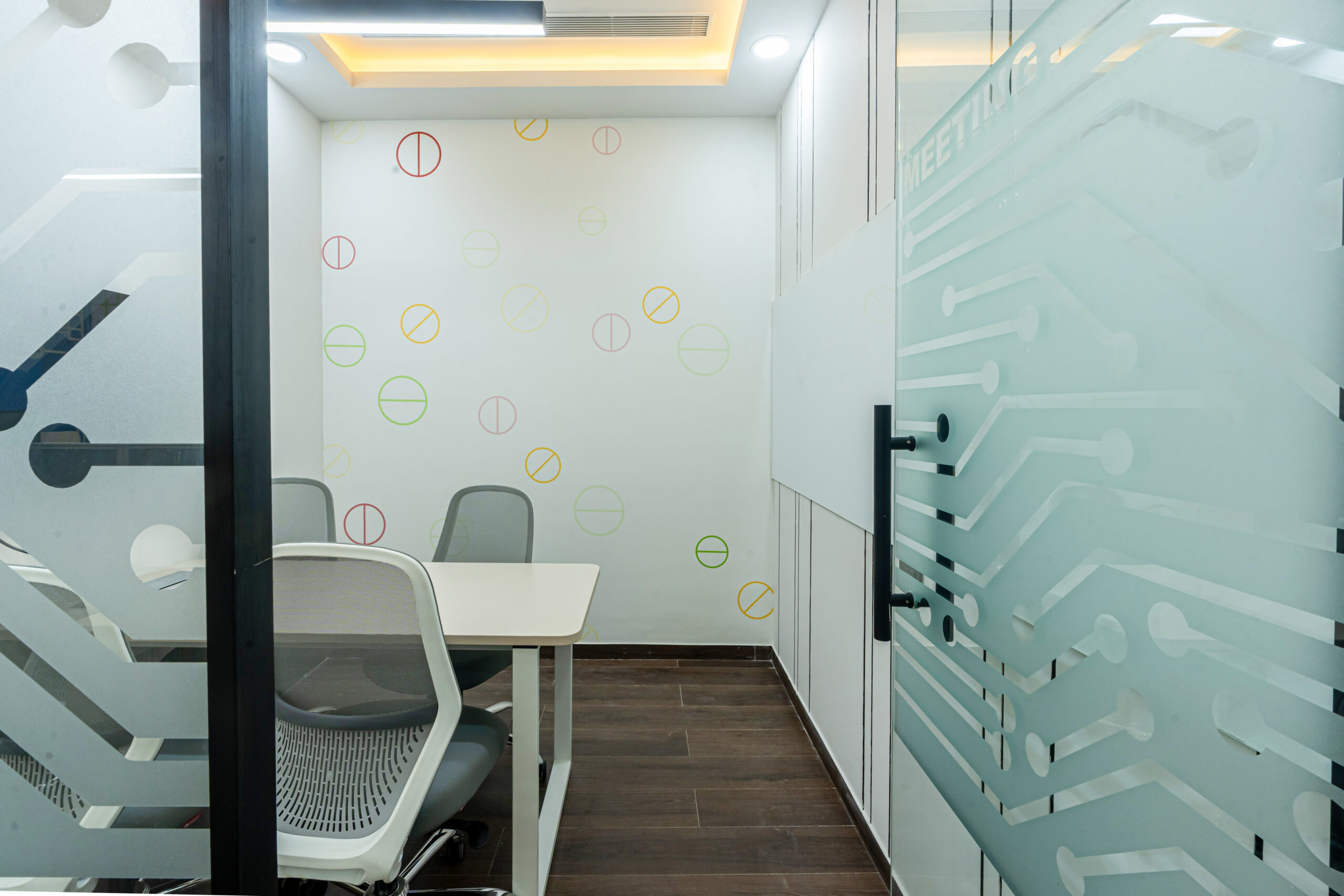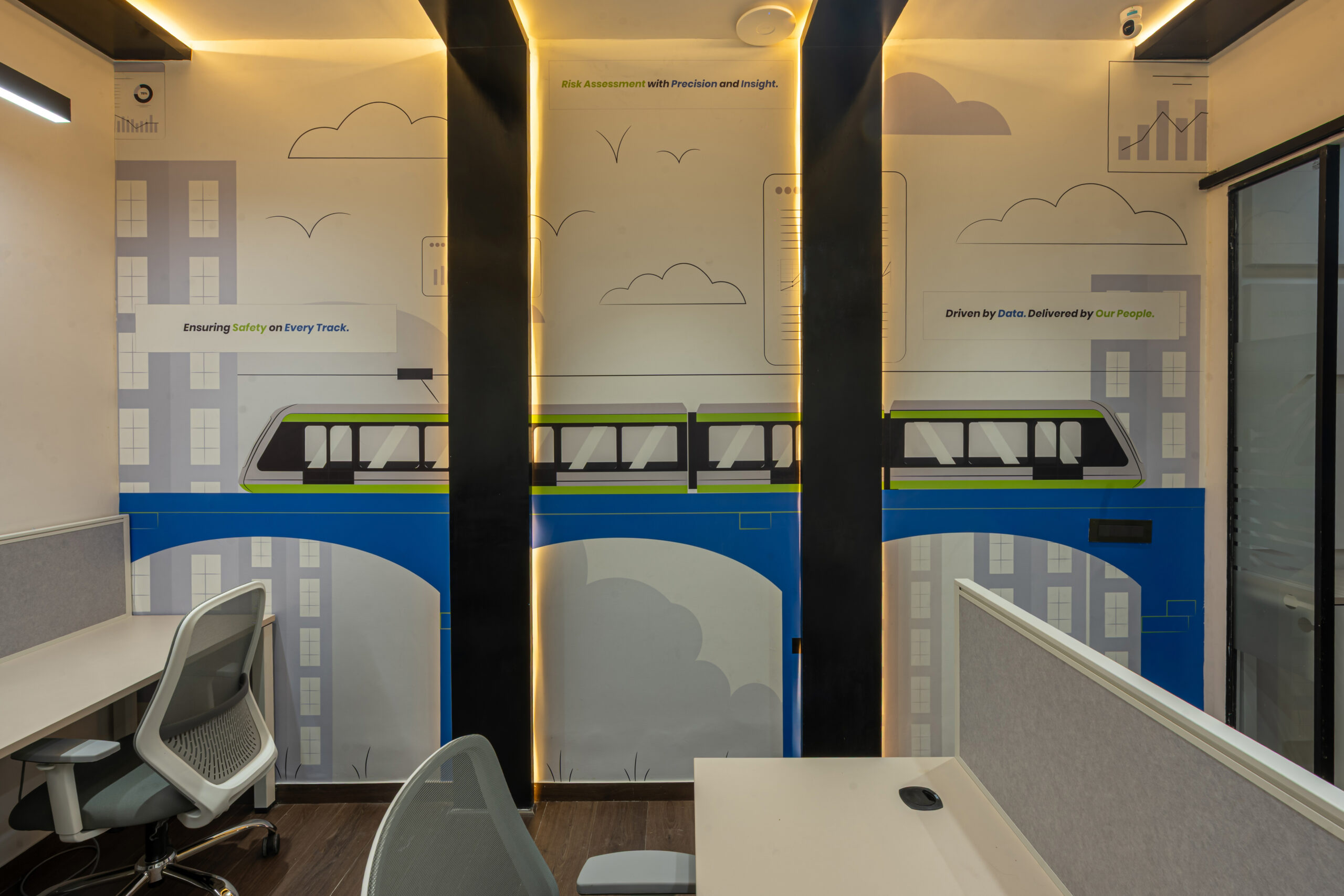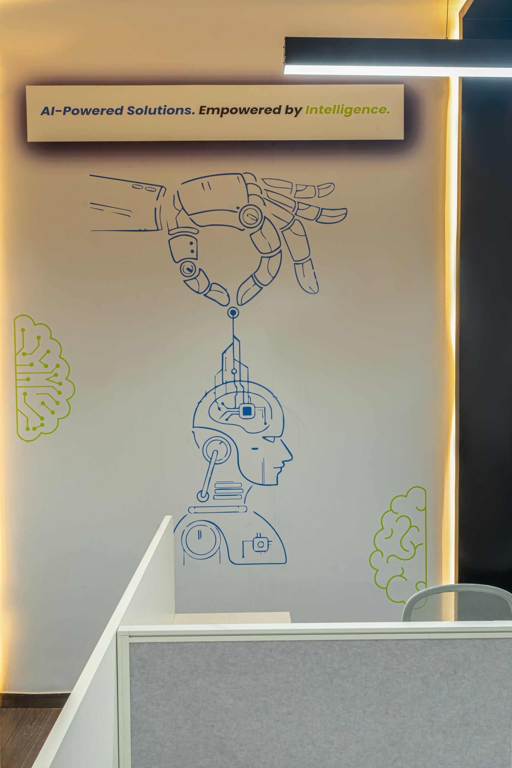 The interior design approach emphasizes clean architectural lines, warm wooden flooring, glass partitions, and integrated LED lighting to create a sophisticated yet welcoming office environment. Custom wall graphics and illuminated feature panels reinforce the company’s brand identity while enhancing spatial depth and visual impact.
