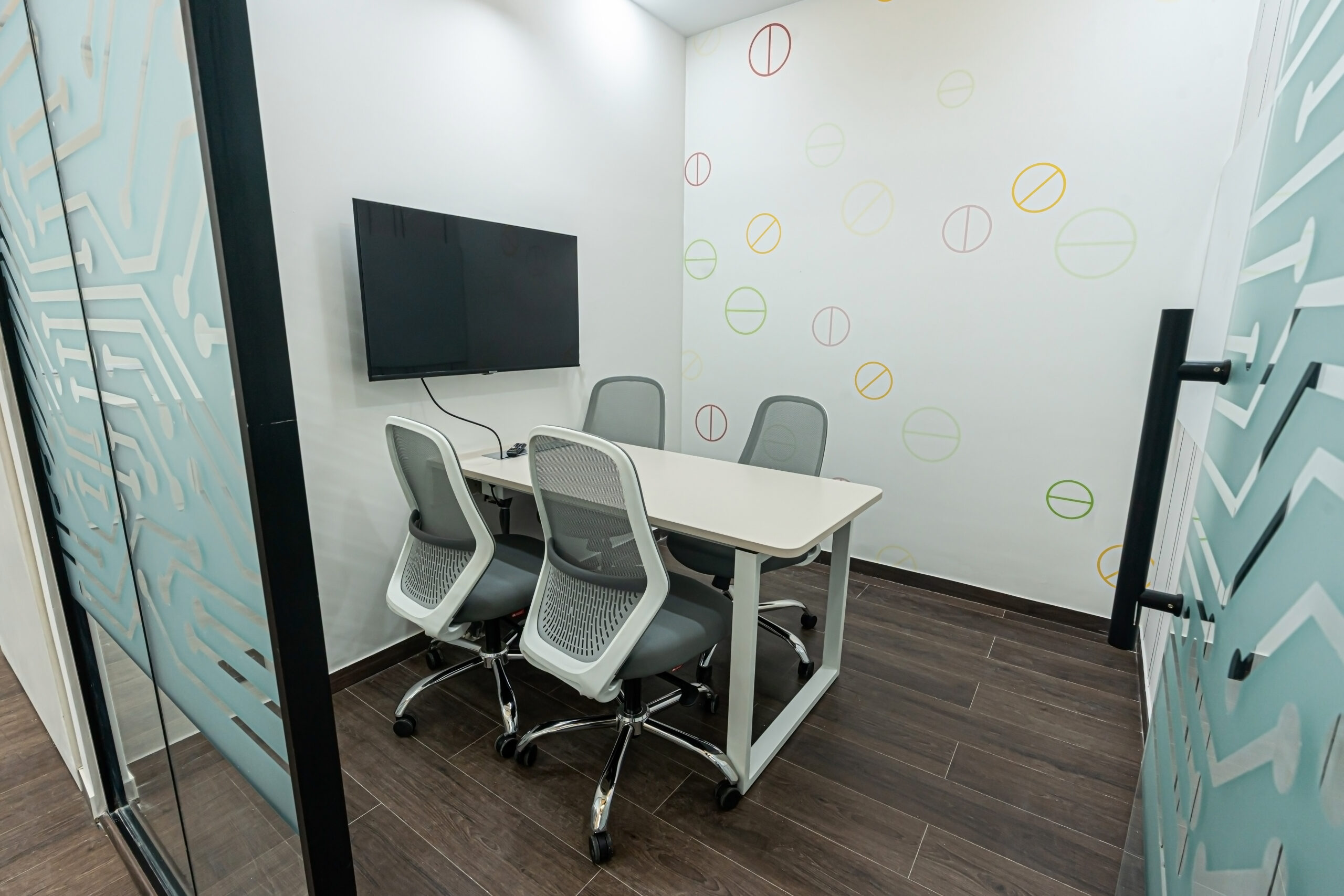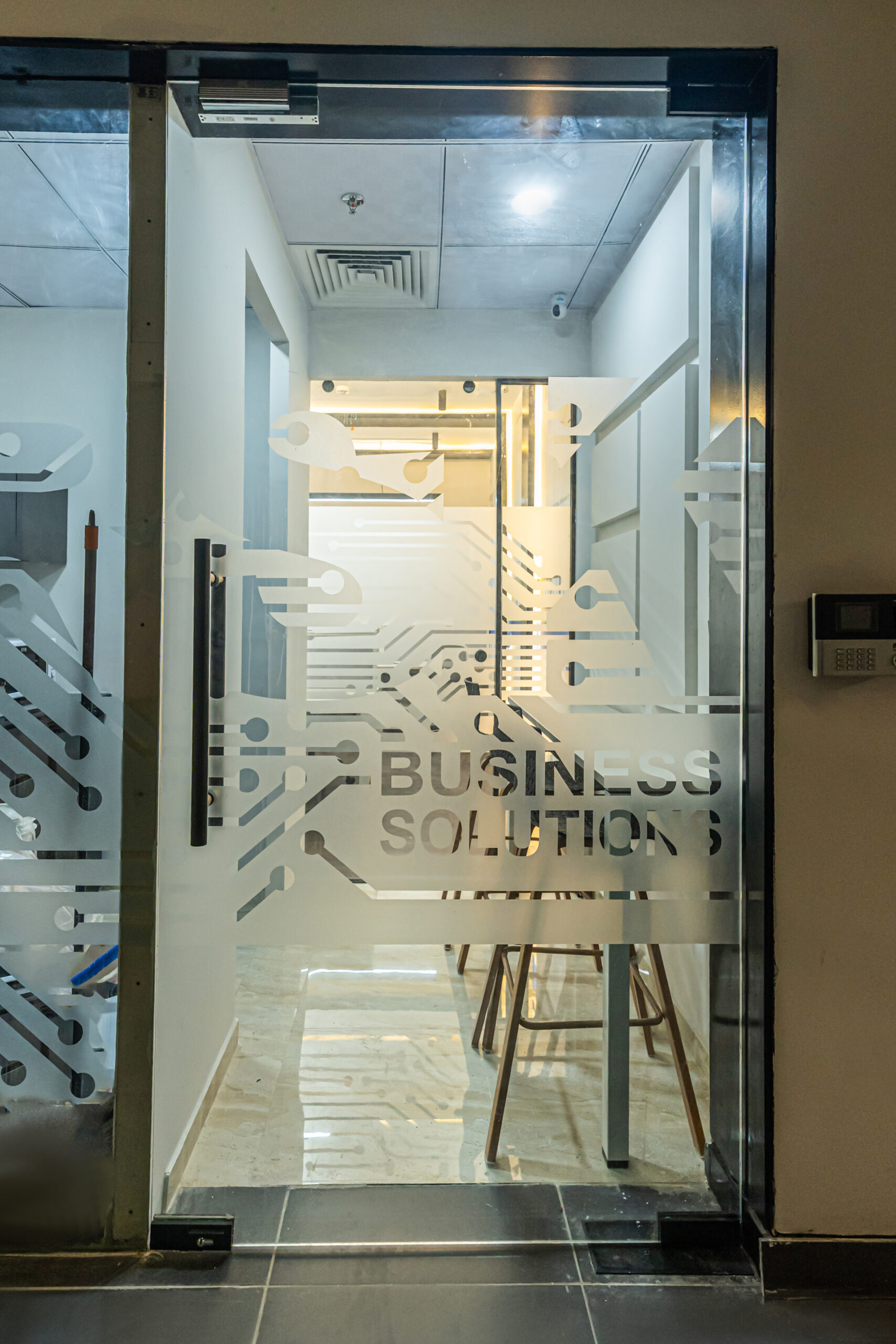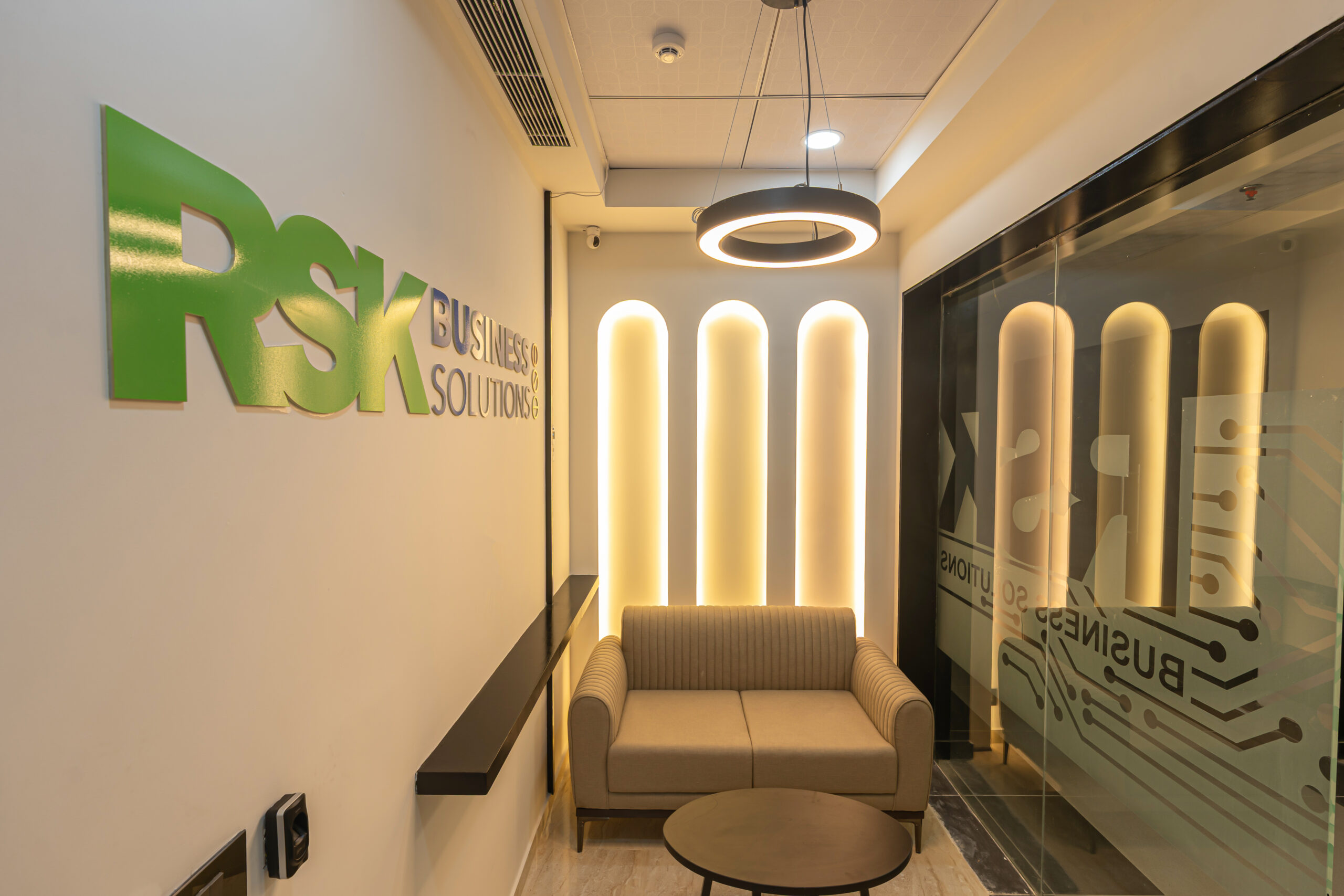 The interior design approach emphasizes clean architectural lines, warm wooden flooring, glass partitions, and integrated LED lighting to create a sophisticated yet welcoming office environment. Custom wall graphics and illuminated feature panels reinforce the company’s brand identity while enhancing spatial depth and visual impact.
