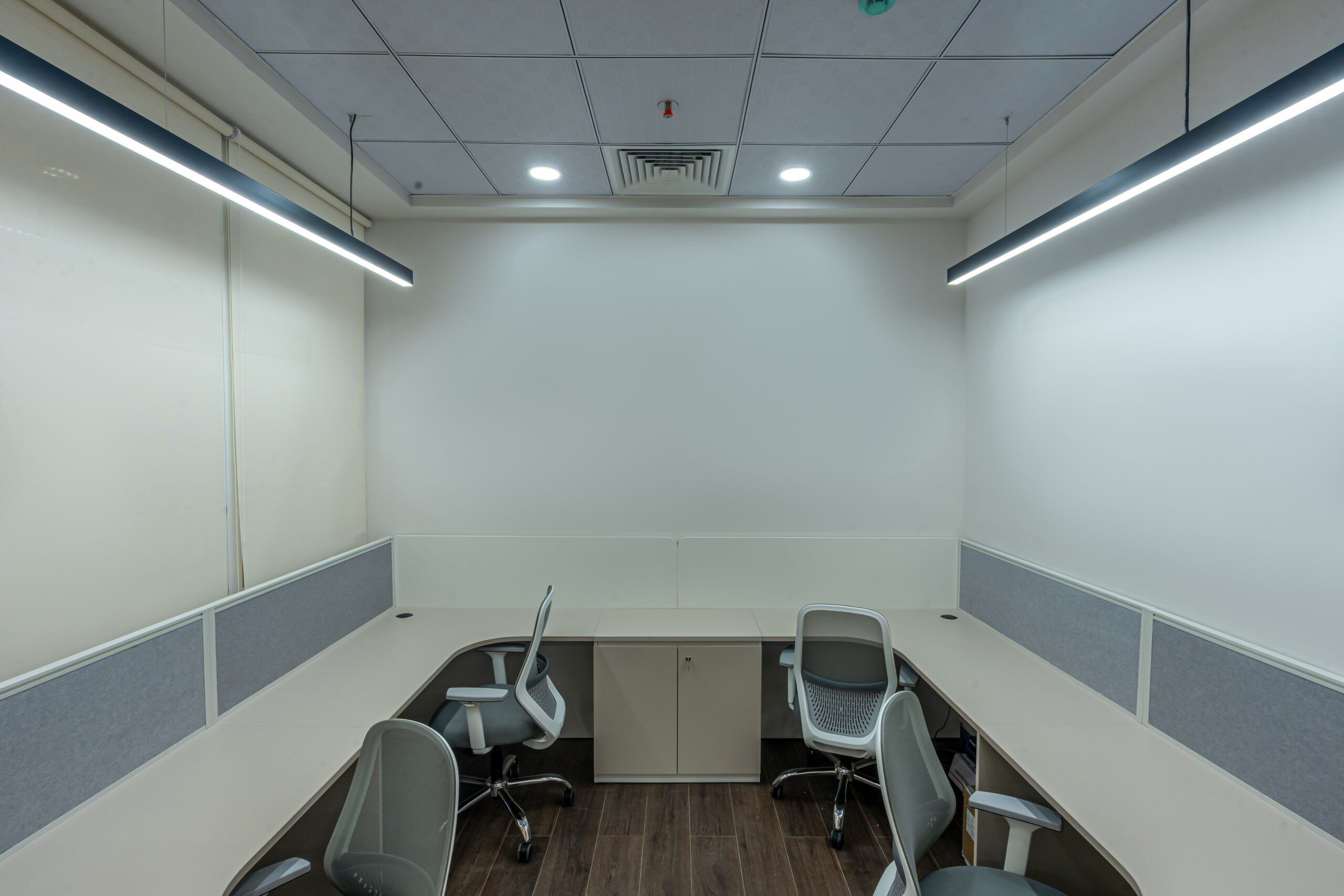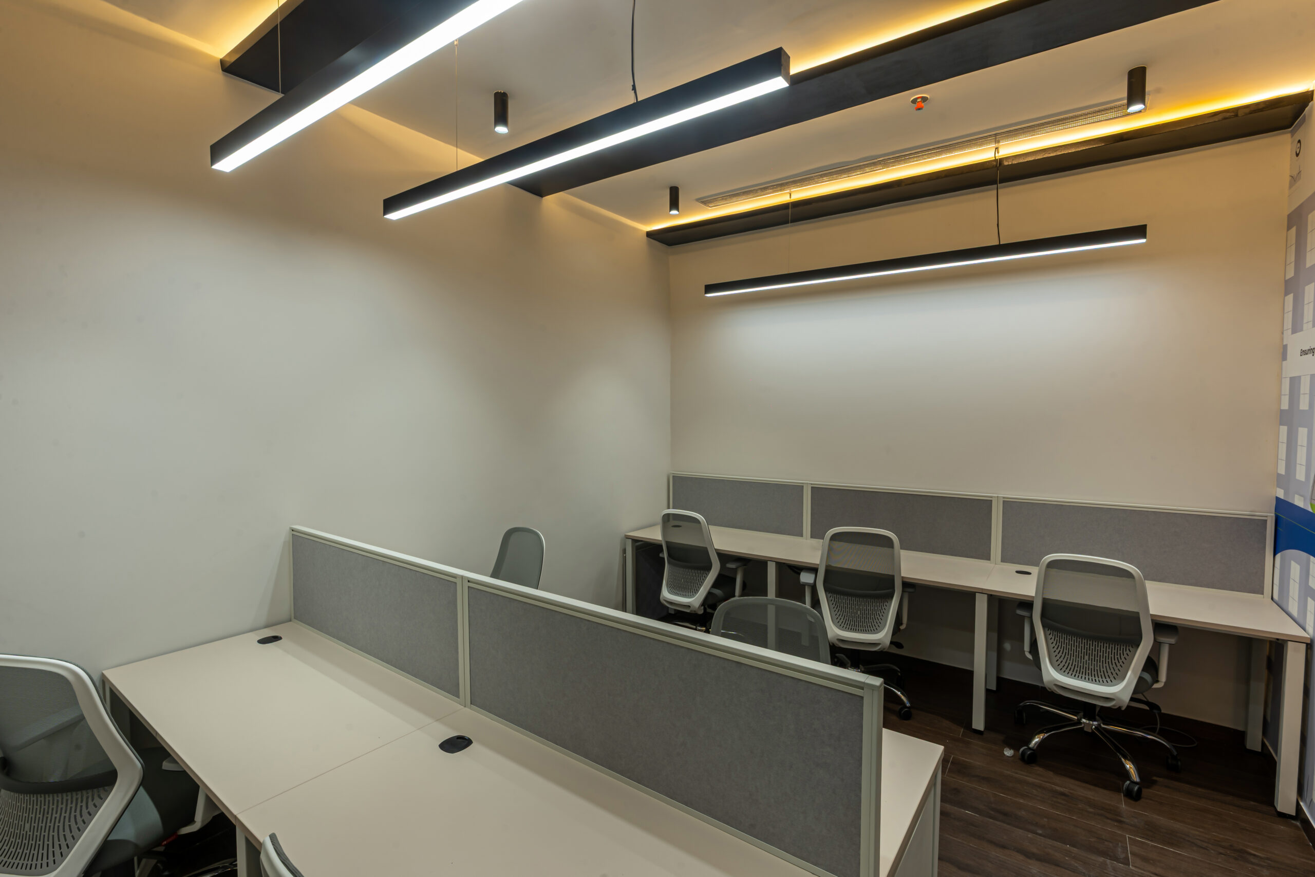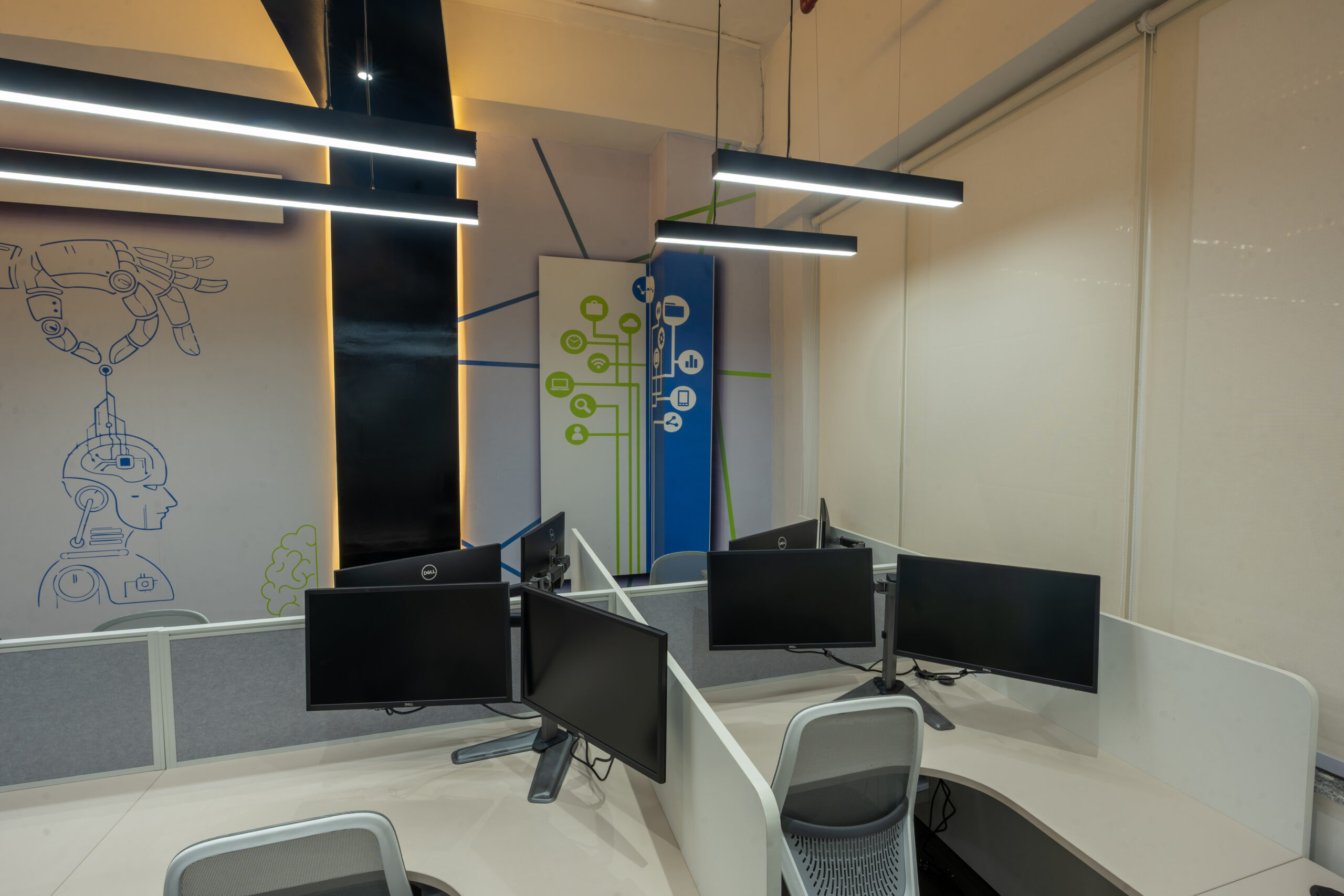 Strategic space planning ensures efficient circulation, ergonomic workstation layouts, and collaborative zones that support productivity. Acoustic treatments and transparent meeting rooms create a balance between open-plan workspace design and focused work areas.